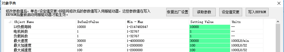 最大加減速度、Jog點(diǎn)動(dòng)參數(shù)、回零參數(shù)等都可通過ServoSoftStudio中的對(duì)象字典編輯器設(shè)置。