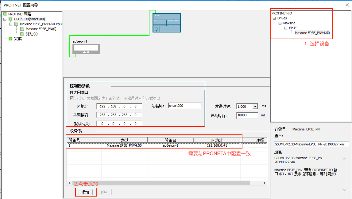 4. 設(shè)置PLC的IP,添加EP3E設(shè)備,并設(shè)置IP與設(shè)備名稱,此處的設(shè)置需要與之前PRONETA工具設(shè)置的一致,之后點(diǎn)擊下一步;