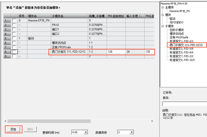 5. 添加111報(bào)文到模塊列表中,最小的更新時(shí)間為4ms,并記住此處分配的輸入輸出起始地址: