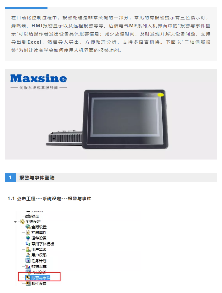 1. 首頁(yè)>文章中心>應(yīng)用教程>邁信電氣MF系列人機(jī)界面_報(bào)警與事件顯示功能案例