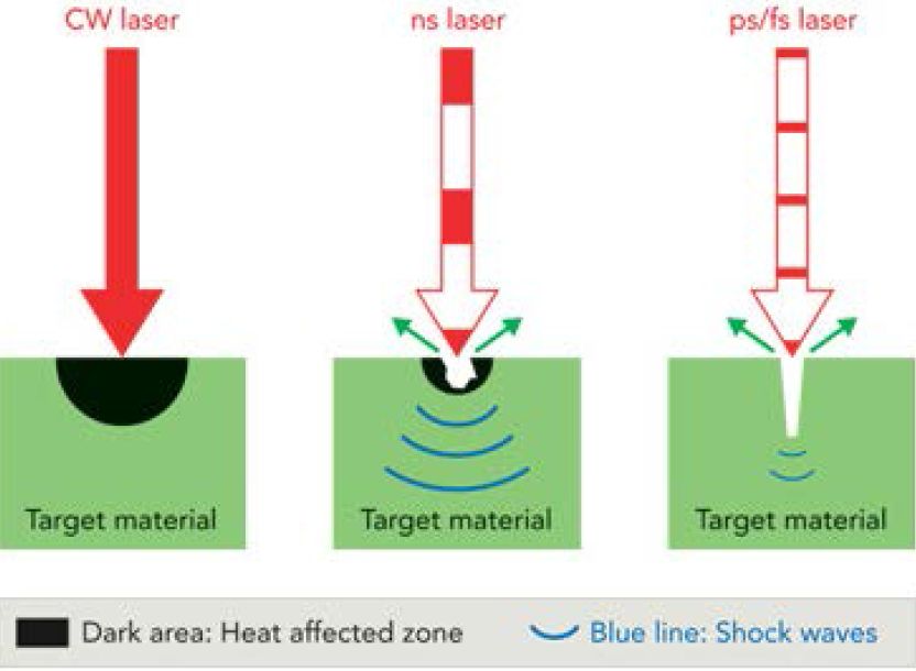 當激光以皮秒量級的脈沖時間作用到材料上時,加工效果會發(fā)生顯著變化。隨著脈沖能量急劇上升,高功率密度足以剝離外層電子。由于激光與材料相互作用的時間很短,離子在將能量傳遞到周圍材料之前就已經(jīng)從材料表面被燒蝕掉了,不會給周圍的材料帶來熱影響,因此也被稱為“冷加工”。憑借冷加工帶來的優(yōu)勢,短與超短脈沖激光器進入到工業(yè)生產(chǎn)應(yīng)用當中。
