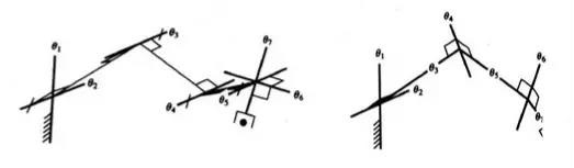 通常空間定位需要6個(gè)自由度,利用附加的關(guān)節(jié)可以幫助機(jī)構(gòu)避開奇異位形。下圖為7自由度操作臂位形。